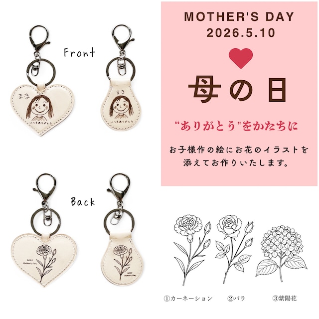 "母の日ギフトedition" "スマホで撮って送るだけ" "子供の絵" から作る世界で一つのキーホルダー *形は丸型、ハート型から選択頂けます。 お子様が描く世界で一つの絵と共にお花をイラストを特別なギフトとして贈りませんか? 表面はお子様が描く絵を刻印いたします。 (追加文字入れをご希望の際は、無料にてお入れいたします) 裏面のお花イラストは、 ①カーネーション ②バラ ③紫陽花 3種類からお選び頂けます。 一年に一回、 日頃の感謝や愛情を込めた贈りものとして、 ご依頼、ご相談受付中です。 お子様とご主人様で連携した、 奥様へのサプライズプレゼントとしても、 とても素敵な一品となります。 ◎ご参考用として、"無料"でイメージ写真をお作りさせて頂いておりますので、 「この質問について相談する」又は「オーダーメイド相談」にて、お気軽にお写真を添付くださいませ。 (即日〜翌日には、お写真をお送りいたします。) (※今は御注文の予定はないが、イメージ写真だけ見てみたい等でも◎ですので、お気軽にご利用下さいませ。) ⭐︎当製品はどんな状態のスケッチでもOKです⭐︎ (薄いえんぴつの絵◎、色ペンの絵◎、影アリの画像◎、お絵描きボードの絵◎、折れ線が入った紙の絵◎等、 当工房では1点1点手作業での編集となり、殆どの画像は受付可能◎ですので、お気軽にご利用下さいませ。) ※こちらで入力する文字入れは"無料"で承らせて頂きます。 (メッセージや、お子様のご年齢、年月日等をお入れ頂くのもオススメです。) 皆様からのご依頼を心よりお待ちしております。 <スペック> 金具:ニッケル 革:ヌメ革(牛) <サイズ> 【仕様】 ・丸型 革パーツ:縦5.5cm / 横4cm ・ハート型 革パーツ:縦5.5cm/横6.5cm